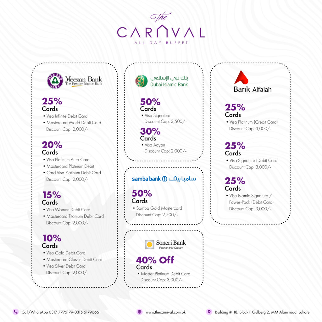 Dine with convenience and savings! Pay with your Debit or Credit cards at The Carnival and enjoy exclusive discounts on your bills.